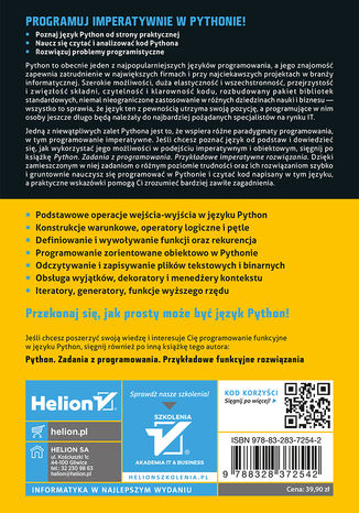 Jedną z niewątpliwych zalet Pythona jest to, że wspiera różne paradygmaty programowania, w tym programowanie imperatywne. Jeśli chcesz poznać język od podstaw i dowiedzieć się, jak wykorzystać jego możliwości w podejściu imperatywnym i obiektowym, sięgnij po książkę Python. Zadania z programowania. Przykładowe imperatywne rozwiązania. Dzięki zamieszczonym w niej zadaniom o różnym poziomie trudności oraz ich rozwiązaniom szybko i gruntownie nauczysz się programować w Pythonie i czytać kod napisany w tym języku, a praktyczne wskazówki pomogą Ci zrozumieć bardziej zawiłe zagadnienia.