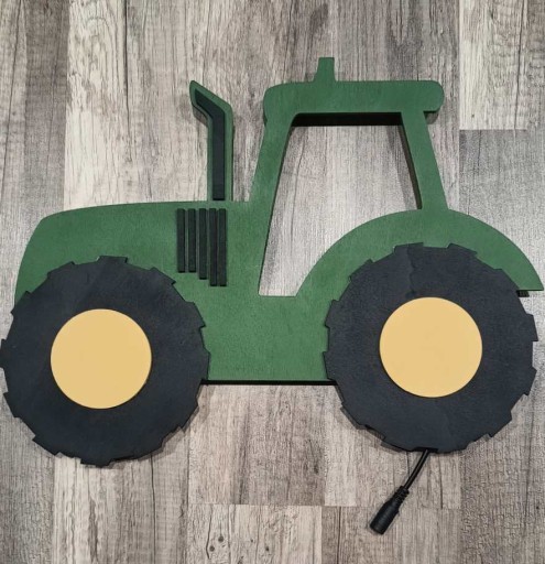 Witaj na aukcji, na której prezentuję wyjątkową, ręcznie wykonaną lampkę drewnianą w kształcie traktora.