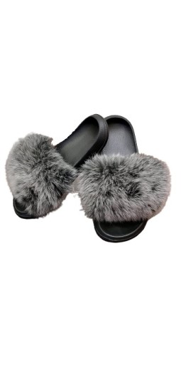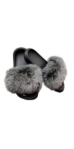 Modne klapki z naturalnym futrem lisa wykonane z lekkiego tworzywa sztucznego.Wierzch pokryty selekcjonowanym naturalnym srebnym futrem lisa. Dzięki grubej, wyprofilowanej podeszwie buty są niezwykle wygodne. Bardzo chętnie noszone przez panie nie tylko jako domowe kapcie.