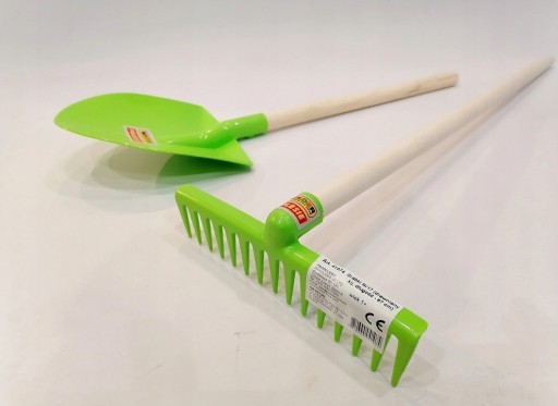 SKŁAD ZESTAWU: TACZKI DZIECIĘCE (z elementami metalowymi) + NARZĘDZIA (grabki zwykłe oraz łopata)+konewka