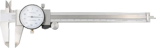 Suwmiarka ze skalą zegarową, FORMATWykonanie: ze stali nierdzewnej, hartowanej, elementy odczytowe chromowane matowo, zębatka schowana, powierzchnie pomiarowe drobno szlifowane, z rolką do precyzyjnej regulacji, śrubą ustalającą i prostokątnym głębokościomierzem. Dostawa w futerale ze sztucznej skóry. Zastosowanie: do pomiarów wewnętrznych, zewnętrznych, głębokości oraz pomiarów stopni.