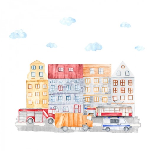 Drukowana naklejka na ścianę MIASTO do pokoju dziecięcego wycinana z folii matowej.