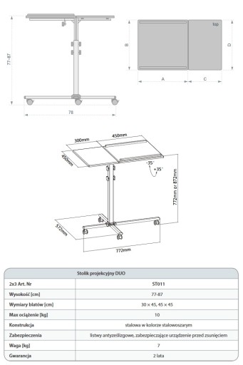 Dwa blaty z czarnego PCV, niezależnie ustawiane na wys. 77 lub 87 cm. Pulpit pod projektor, z listwami antyześlizgowymi, pozwala na regulację kąta nachylenia ±35°. Konstrukcja z profili stalowych, lakierowana w kolorze stalowoszarym. Podstawa z 4 kółkami (2 z blokadą).