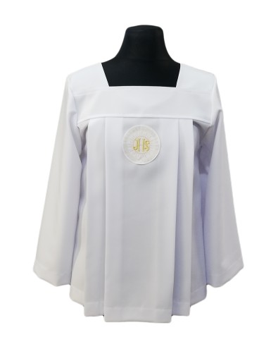 Komża Komunijna bez nadmiaru zdobień, skromna z wszytą hostią. Została uszyta z tkaniny syntetycznej typu "strecz". Komża bardzo praktyczna w użytkowaniu, łatwo się pierze, prasuje. Komża nie gniecie się, nie prześwituje. Komża dostępna jest w rozmiarach od 134-146