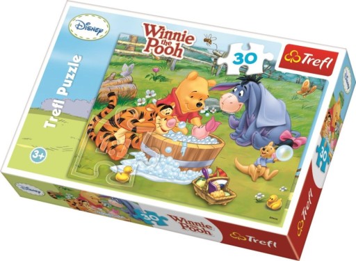 Zestaw puzzli Kąpiel Prosiaczka składa się z 30 elementów i umożliwia ułożenie ślicznego, niezwykle kolorowego obrazka przedstawiającego Prosiaczaka w bali z wodą, kąpanego przez Kubusia Puchatka, Tygryska, Kłapouchego oraz Maleństwo. Pojedynczy element układanki ma wymiary 5,5 x 5,5 cm, dzięki czemu doskonale sprawdzi się dla młodszych dzieci. Ułożony obrazek ma wymiary 27 x 20 cm. Puzzle są wykonane z kalandrowanego papieru odbijającego światło oraz z ekologicznych materiałów, dzięki czemu cechuje je wysoka jakość, duże nasycenie kolorów i bezpieczeństwo zabawy.