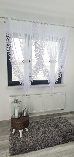 Zestaw dwóch firan połączonych taśmą marszczącą . Firany do zawieszenia bezpośrednio na karniszu rurkowym ( posiadają tunel ) , bądź na żabkach . Wszyta taśma pozwala na dowolne zmarszczenie firanki przez co bez trudu można dopasować ja do szerokości karnisza . Firana przed zmarszczeniem posiada szerokość 400 cm .