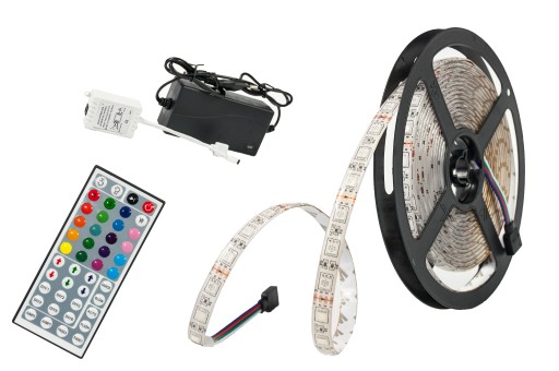 Elastyczna, mocna i wygodna taśma zapewnia szybkość instalacji. Taśma posiada 300 diod 5050 MULTI-KOLOR na rolce 5m. Diody świecące jednym z czterech podstawowych kolorów: czerwonym, zielonym, niebieskim i białym. Za pomocą pilota możemy włączać każdy z tych kolorów oraz zmieniać je w dowolnym momencie. Kontroler wyposażony jest w 44 przyciski, możemy przyciemnić lub rozjaśnić wybraną barwę. Zmiany naprzemiennej, zmiany koloru, efekt ściemniania (rozjaśniania) i efekt stroboskopowy.