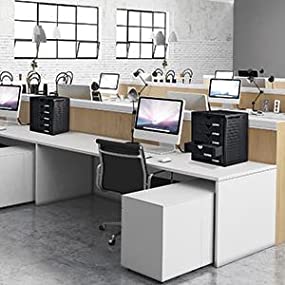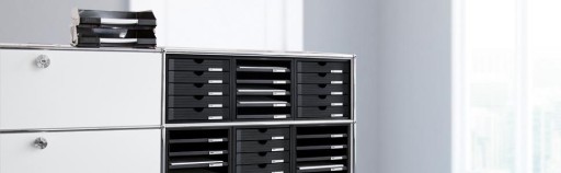 - Szafka z szufladami z otworem do chwytania, blokada zapobiegająca wypadaniu dokumentów i klipsy z etykietami są zdejmowane, zewnętrzne wymiary: wysokość i głębokość – są dostosowane do wymiarów segregatorów.