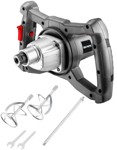 Mieszarka elektryczna GRAPHITE z silnikiem o mocy 1250 W, przeznaczona do mieszania masy gipsowej, zapraw klejowych lub farb. Mieszarka dzięki wytrzymałej konstrukcji oraz wydajnemu systemowi odprowadzania ciepła przystosowana jest do pracy ciągłej przy pracach wykończeniowych na średnich placach budowy. Mieszarka posiada możliwość regulacji prędkości obrotowej wrzeciona. Odpowiednio wyprofilowana rękojeść urządzenia pozwala na wygodną i bezpieczną pracę przez długi czas. Również dla bezpieczeństwa mieszarka została wyposażona w blokadę, uniemożliwiającą przypadkowe włączenie. W zestawie z mieszarką znajdują się dwa mieszadła, jeden trzpień oraz dwa klucze.