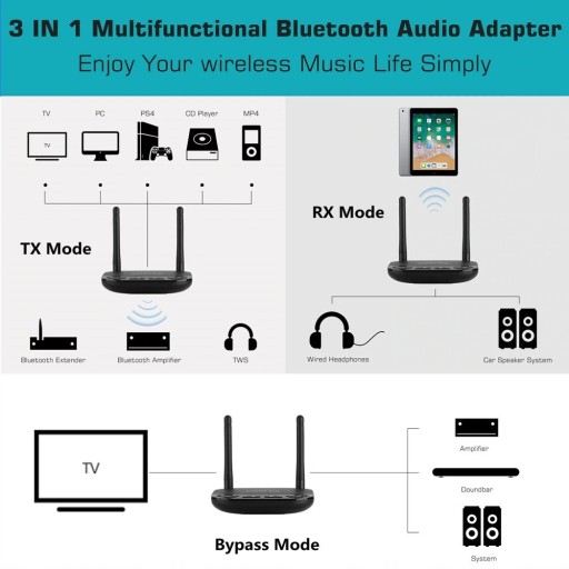 Służy do przekazywania muzyki nadawanej przez komunikację Bluetooth z urządzeń takich jak smartfon czy tablet, do odbiorników typu amplituner, zestaw głośnikowy lub odtwarzacz car audio za pomocą przewodu aux 3,5mm, Toslink lub aux/RCA.