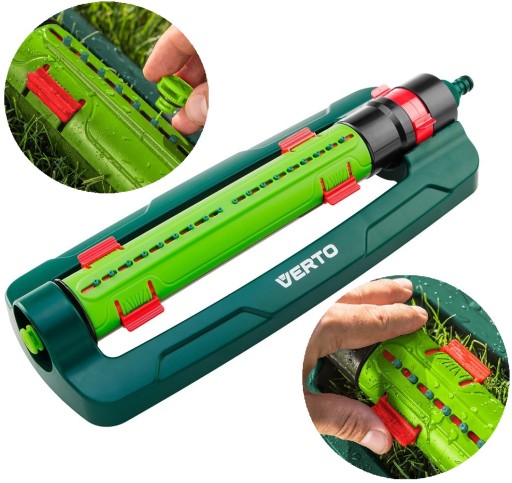 Zraszacz oscylacyjny od ogrodniczej marki VERTO, nawadniający powierzchnię na planie prostokąta, o wymiarach maksymalnych 15 x 19 m. Produkt posiada 18 dysz zraszających, umiejscowionych na pałąku, który zamocowany jest w środku trwałej ramy z tworzywa sztucznego.