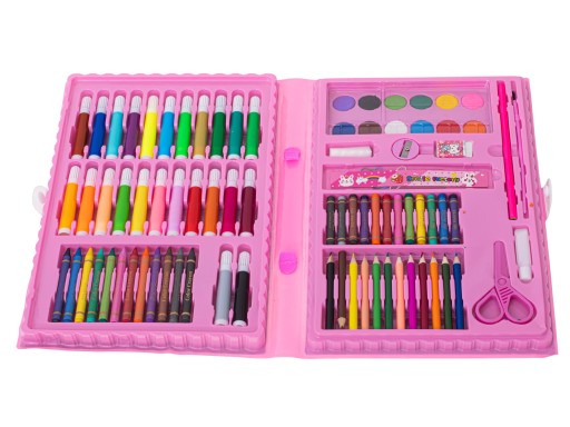 Przybory każdego rodzaju zebrane w jeden zestaw, który łatwo zabierzesz ze sobą, ze względu na poręczną formę - kolorową walizkę.