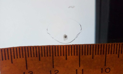 SZYBA DELIKATNIE PORYSOWANA Z NAPRAWIONĄ I ZABEZPIECZONĄ KROPKĄ W ZAZNACZONYM MIEJSCU.
