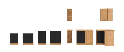 MODERN to zestaw mebli kuchennych dostępny w kolorze CZARNY MAT (dolne) / DĄB ARTISAN. Korpus w kolorze Dąb Artisan wykonany z płyty wiórowej o grubości 16 mm. Fronty wykonane z płyty, oklejone PCV w kolorze Czarny Mat dolne i Dąb Artisan górne. Całość zdobią czarne uchwyty. System został wyposażony w cichy domyk frontów i szuflad. Kolorystyka blatu dedykowanego to Dąb Artisan o grubości 28mm. (BLAT NIE JEST WLICZONY W CENĘ). W cenę szafek nie jest wliczone wyposażenie AGD oraz elementy dekoracyjne. S