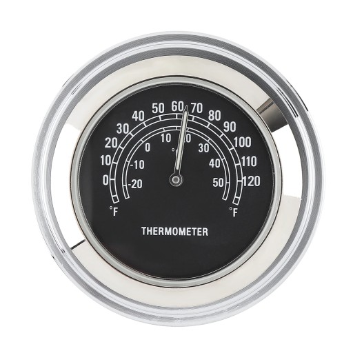 Elegancki chromowany termometr na niemalże każdą kierownicę. W zestawie z kluczem imbusowym do montażu i gumową opaską na kierownicę.