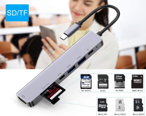 Wysokiej jakości designerski multi-port 7w1 adapter dla Twojego urządzenia. Wysokiej jakości - obudowa wykonana z aluminium w kolorze gray. Hub usb wyposażony w szereg niezbędnych portów, HDMI, 2x USB 3.0/2.0, czytniki kart pamięci oraz 2x USB-C.