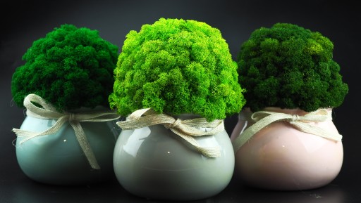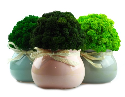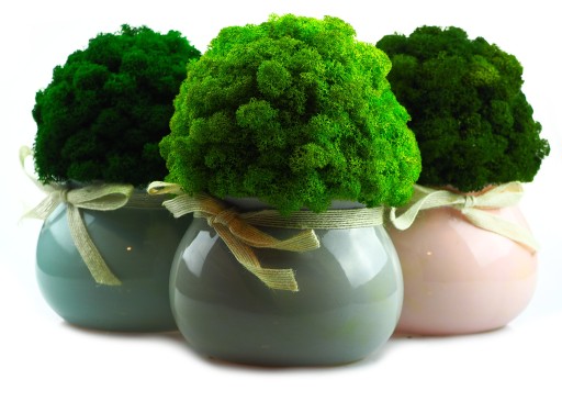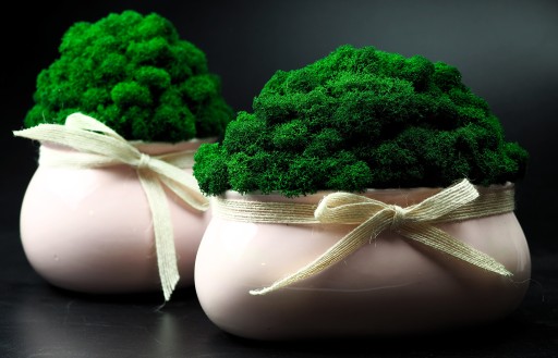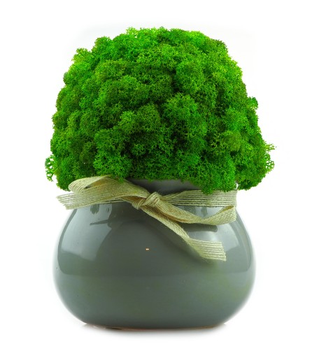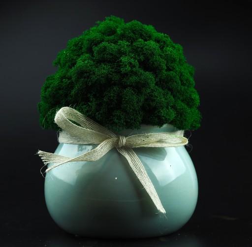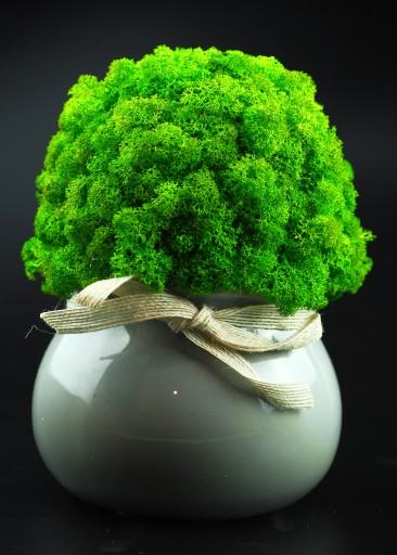 Najwyższej jakości doniczka wykonany z wyselekcjonowanych kępek mchu chrobotek. Kolor mchu intensywnie zielony. Swoją barwę mech zawdzięcza naturalnemu barwnikowi. Zapewniamy, że mech nawet po długim okresie nie zmieni swojej barwy. Jest praktycznie bezobsługowy. Może zostać wykorzystany w łazience w której panuje duża wilgotność. Nie straszne mu również promienie UV, lecz po długiej ekspozycji na ciepło musi zostać delikatnie zroszony mgiełką wody. Pochodzi ze skandynawskich lasów.