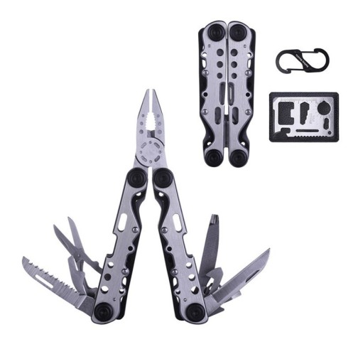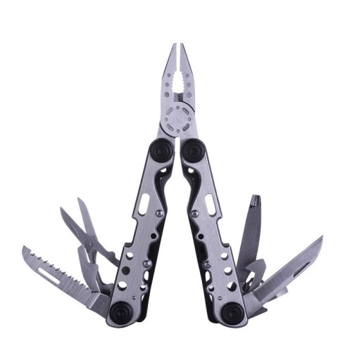 Uniwersalny multitool to kompletny zestaw narzędzi kieszonkowych, który składa się m.in. z kombinerek, scyzoryka czy pilnika oraz eleganckiego etui. Zestaw jest niewielkich rozmiarów a tym samym funkcjonalny i kompaktowy a co najważniejsze posiada niezliczoną ilość zastosowań. Multitool idealnie sprawdzi się podczas wyprawy, survivalu, w domu, na campingu, biwaku itd.
