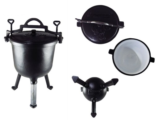 Kociołek wyposażony jest w pokrywę z otworem, trzy stabilne nóżki oraz przykręcany uchwyt dociskający pokrywę. Grube dno kociołka żeliwnego sprawia, że przygotowane dania wolną stygną.