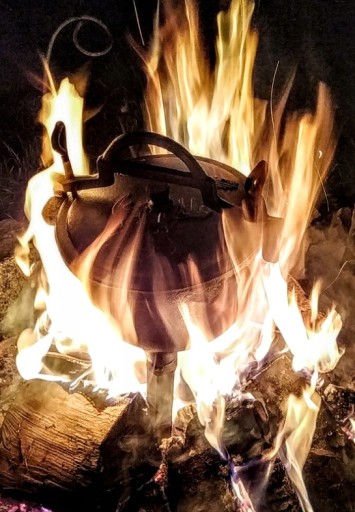 Kociołek może stać bezpośrednio w ognisku lub być zawieszony nad ogniskiem.