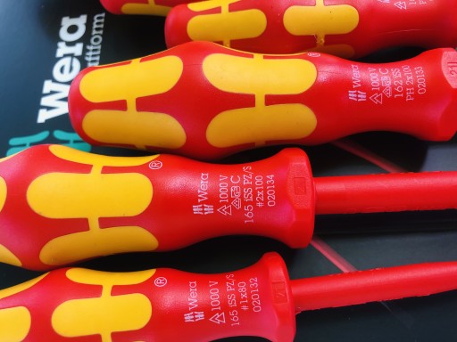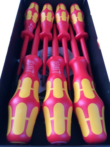 Zestaw 7 wkrętaków Kraftform VDE iSS, ze zredukowaną średnicą trzpienia i rękojeści do prac w wąskich przestrzeniach oraz do zagłębionych połączeń śrubowych i sprężyn; każde narzędzie testowane pojedynczo zgodnie z IEC 60900; kontrola izolacji poprzez zanurzenie w kąpieli wodnej pod napięciem 10000 V gwarantuje bezpieczeństwo pracy pod napięciem 1000 V.