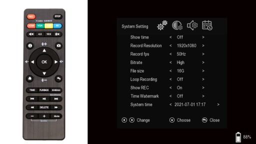 Pozostałe opcje, takie jak ustawienia rozdzielczości, bitrate, czy parametrów obrazu dostępne są przez menu ekranowe.