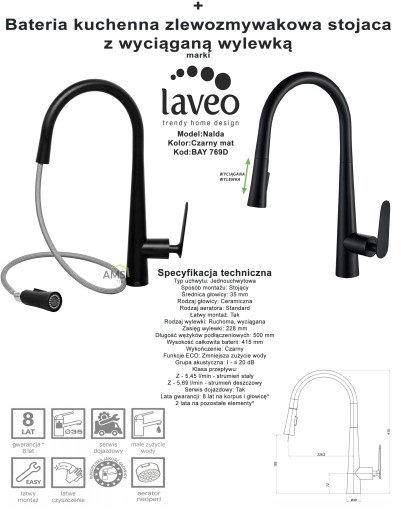 - BATERIA ZLEWOZMYWAKOWA STOJĄCA Z WYCIĄGANĄ WYLEWKĄ LAVEO NALDA W KOLORZE CZARNY MAT