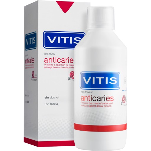 Vitis anticaries to codzienny płyn do pielęgnacji zębów, który zapobiega powstawaniu próchnicy i chroni przed kwasową erozją szkliwa.
