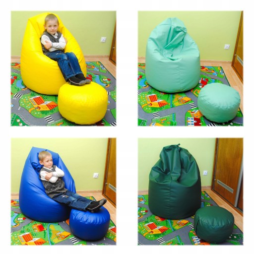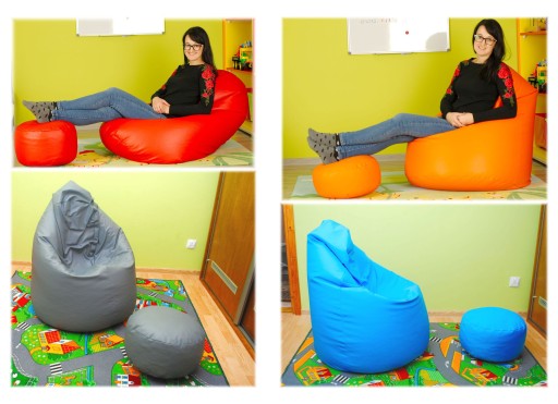 Oferowany produkt to fotel sako standard z podnóżkiem. Jego wymiary to 110cm wysokości oraz 80cm średnicy podstawy, ma 300L objętości. Wymiary podnóżka to 40cm średnicy oraz 25cm wysokości. W fotelu zastosowano wypełnienie styropianowe, dzięki któremu sako jest bardzo lekkie oraz łatwo układa się do kształtu sylwetki. Worek jest meblem bezszkieletowym, zalecanym przez producenta zarówno dla dzieci jak i dorosłych. Został wykonany z ekoskóry, która posiada atest PZH.