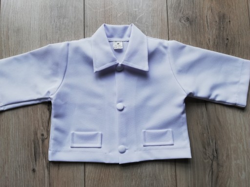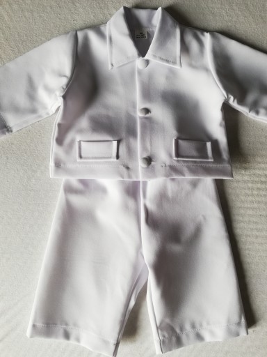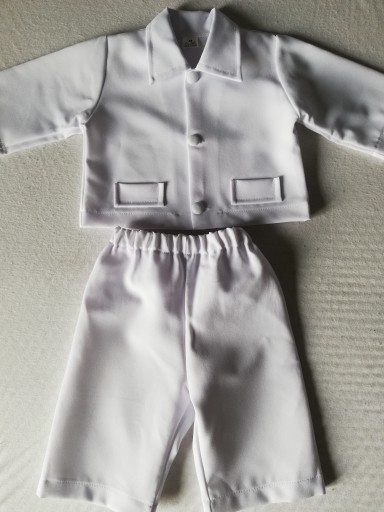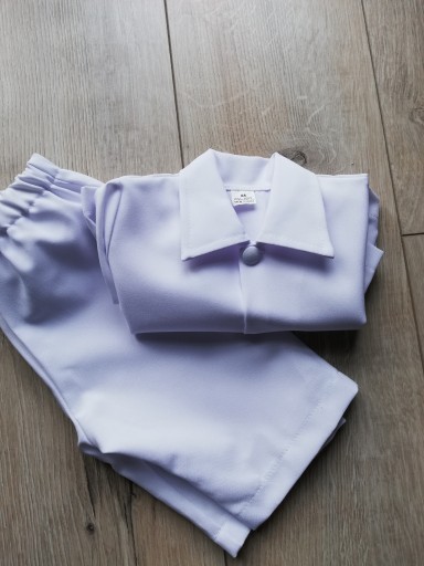 W skład kompletu wchodzą spodnie na gumce i biała koszula/marynarka. Kolor śnieżnobiały.