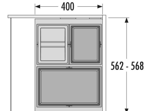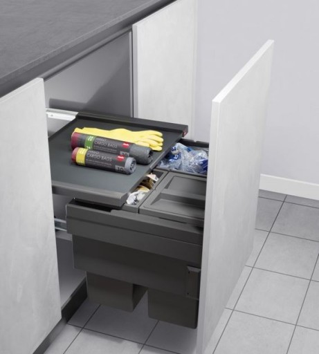Kosz systemowy niemieckiego producenta HAILO. Osadzony na prowadnicach jednego z najlepszych producentów systemów jezdnych - Grass. Prowadnice z wbudowanym hamulcem. Trzy oddzielne pojemniki dla lepszej organizacji odpadów. Konfiguracja: 1 x 28l + 2 x 13l. Kolor ciemny szary.