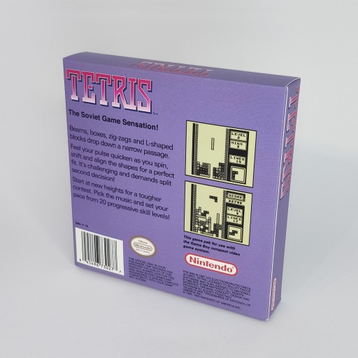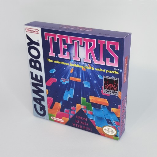 Replika opakowania do gry Tetris na konsolę Nintendo GameBoy Classic | Color | Advance. Pudełka wykonane są z papieru o grubości 300g/m² z półbłyszczącym wykończeniem - zbliżone do oryginału.