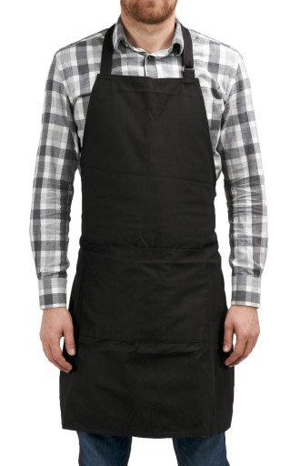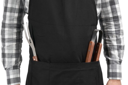 Praktyczny, bawełniany fartuch w eleganckiej czerni, chroniący odzież podczas grillowania i pracy w kuchni
