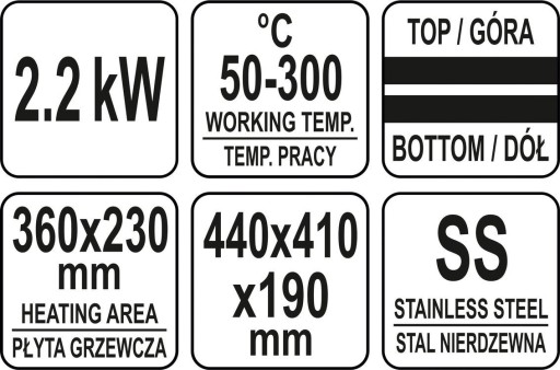 Grzałka o mocy 2,2kW sterowana jest za pomocą potencjometru umieszczonego na płycie frontowej. Możliwe jest ustawienie temperatury pracy w zakresie 50~300℃. Zainstalowany bryzgoszczelny wyłącznik pozwala na wyłączenie grilla, gdy jest on nieużywany, bez konieczności odłączania kabla zasilającego z sieci. Grill zasilany jest prądem o napięciu 230V~50Hz.