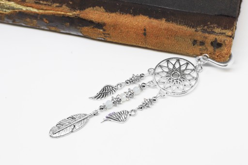 Elegancka zakładka do książki z zawieszką w kształcie łapacz snów z dodatkiem srebrnego hematytu i niebieskiego akwamarynu.
