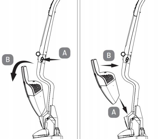 W prosty i szybki sposób zmienisz odkurzacz pionowy w ręczny : Wystarczy wcisnąć przycisk blokady (A), wyjąć za rączkę odkurzacz ręczny (B) i urządzenie jest gotowe do pracy.