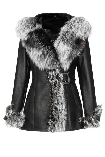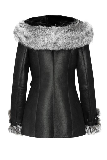Naturalny kożuch z miękkich skór owczych w kolorze czarnym. Obszyty srebrnym lisem. Posiada okazały i miły w dotyku kaptur. Zapinany na pasek z klamrą i guzik po szyją (dodatkowo można doszyć we własnym zakresie 3 guziki do przygotowanych pętelek).