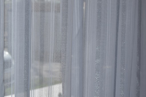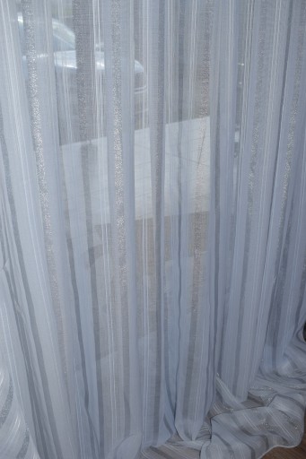 oprócz białej=śmietanowej nitki wpleciono srebrne mieniące się PASY SZRONU przez co tkanina magicznie połyskuje podnosząc jej walor estetyczny.