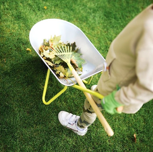 Zestaw narzędzi ogrodowych składający się z taczki o pojemności ok. 10 litrów, rękawice ogrodnicze ze 100% bawełny, szpadel i grabie, młodzi ogrodnicy-hobbyści mogą aktywnie wspierać swoich rodziców w ogrodzie.
