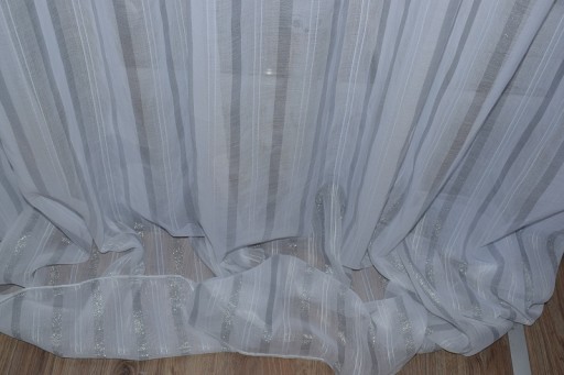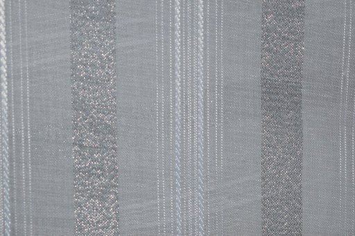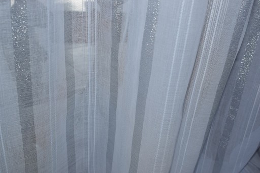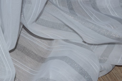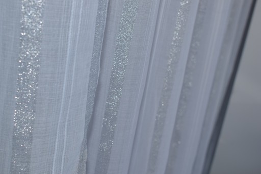 oprócz białej=śmietanowej nitki wpleciono srebrne mieniące się PASY SZRONU przez co tkanina magicznie połyskuje podnosząc jej walor estetyczny.