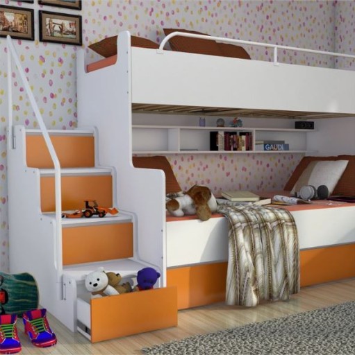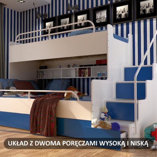 - Schodki z boku łóżka pełnią funkcję pojemników, które wysuwa się na prowadnicach rolkowych,