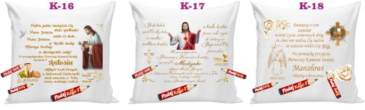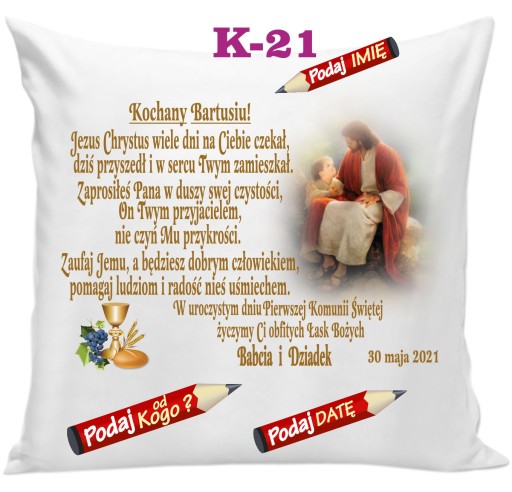 Wzruszająca a zarazem praktyczna poduszka z imieniem dziecka i życzeniami – pamiątka Komunii Świętej z datą przystąpienia do Pierwszej Komunii.