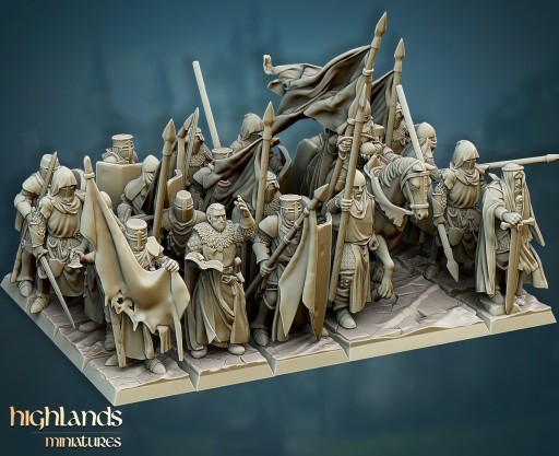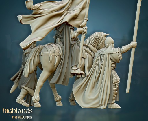 Przedmiotem oferty jest zestaw modeli Sacred Reliquary (1 jedździec + 2 pieszych) od Highlands Miniatures, wydrukowanych na drukarce 3D w technologii SLA.