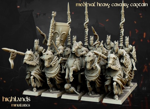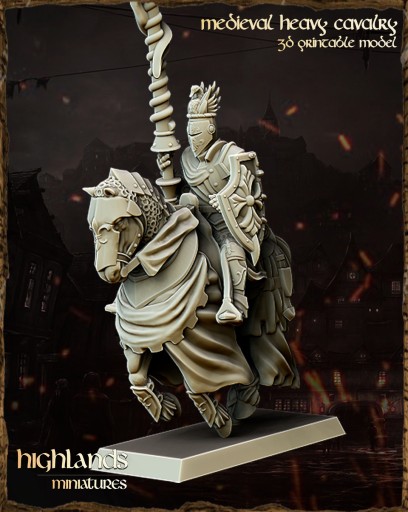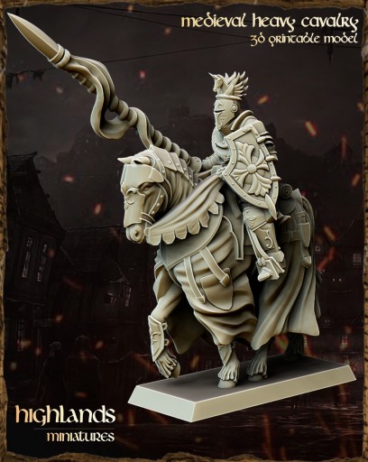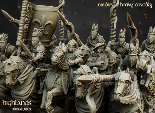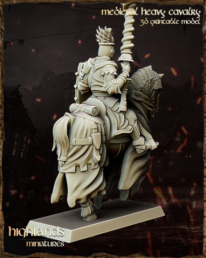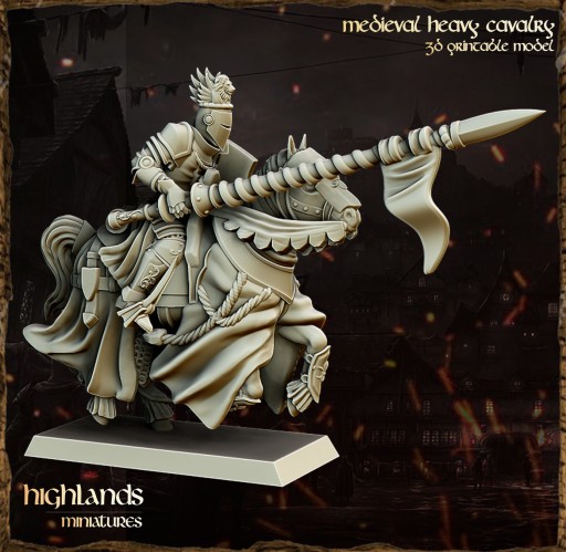 Przedmiotem oferty jest zestaw 3 modeli Heavy Cavalry / Knight of the Realm od Highlands Miniatures, wydrukowanych na drukarce 3D w technologii SLA.