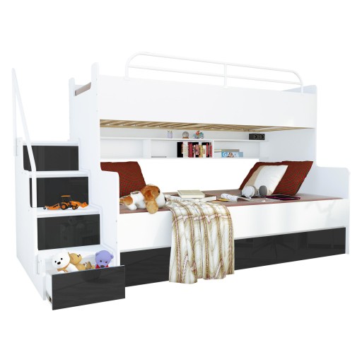 - Schodki z boku łóżka pełnią funkcję pojemników, szuflady wysuwa się na prowadnicach rolkowych,