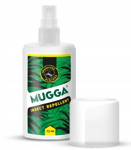 MUGGA w sprayu dla osób dorosłych oraz dzieci od 2 roku życia, o silnym, odstraszającym działaniu przeciwko komarom (europejskim i tropikalnym), muchom, muchom krwiopijnym, meszkom, moskitom, gzom, bąkom, kleszczom i innym insektom. Zabezpiecza przed ukąszeniem przez 6 godzin od zastosowania. Ma przyjemny zapach, można je bezpiecznie stosować na preparaty do opalania i inne kosmetyki.