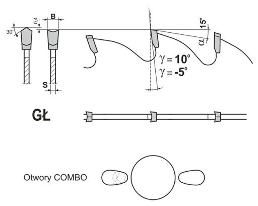 - piła o specjalistycznej geometrii ostrza GŁ10 (pozytyw) i GŁ-5 (negatyw) z wklęsłą (łukową) powierzchnią natarcia zęba, dedykowana do obróbki płyt wiórowych okleinowanych i laminowanych