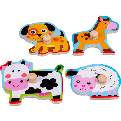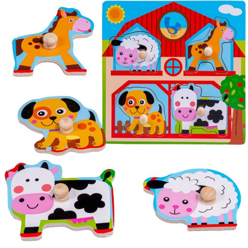 Drewniana układanka puzzle - uchwyty z wizerunkiem traktora i zwierzątek z farmy. Rozwija w dzieciach spostrzegawczość oraz wyobraźnię.