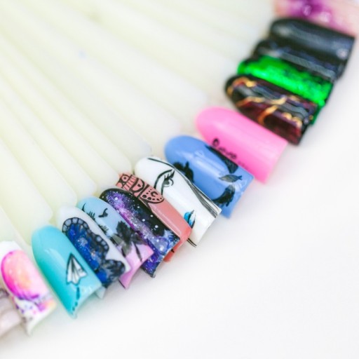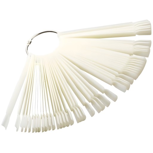 Praktyczny wzornik lakierów z 50 tipsami w kolorze mlecznym. Próbnik w formie wachlarza na metalowym kółku. Będzie bardzo pomocny podczas wybierania koloru lakieru lub wzorku na paznokcie. To bardzo czytelna, wygodna oraz estetyczna paleta do malowania lakierami klasycznymi, hybrydowymi lub żelami. Wzornik jest poręczny, solidnie wykonany, przydatny w każdym salonie kosmetycznym.