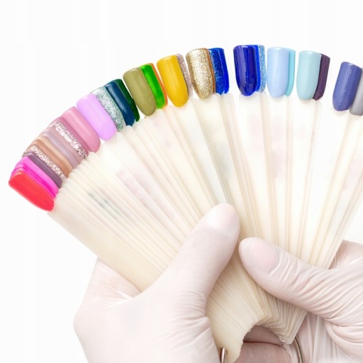 Wzornik w formie wachlarza umożliwia wygodne porównywanie różnych odcieni lakierów na jednym miejscu. Można łatwo zobaczyć, jak poszczególne kolory wyglądają obok siebie, co ułatwia wybór odpowiedniego koloru do manicure lub pedicure.